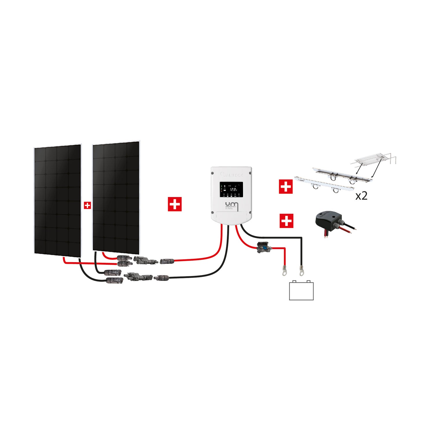 I kit solari Uniteck sono composti di tutti gli elementi necessari a un’installazione elettrica efficiente e autonoma.I kit nautica sono destinati a imbarcazioni da diporto: veliero, motoscafo, péniche …Il kit nautica 330W permette di alimentare i vostri apparecchi elettrci (elettrodomestici, apparecchi portatili, eletronici...) a bordo dell'imbarcazione.I pannelli con tecnologia back contact hanno il vantaggio di essere più compatti dei pannelli monocristallini standard, e sono quindi la soluzione ideale per applicazioni il cui ingombro o il peso sono criteri da prendere in considerazione.Il suo sistema di fissaggio universale permette un’installazione facile su tutti i rollbar con doppia barra.. Progettato e fabbricato in Francia, il supporto è robusto e completamente protetto contro la corrosione. Il regolatore MPPT utilizza l’intera potenza pannello e permette quindi una perfetta ricarica delle batterie di tutte tecnologie (AGM, Gel, batteria a liquido…), pur preservando la sua durata di vita.Il kit di collegamento in 6mm² ottimizza l’efficienza elettrica della vostra installazione limitando le perdite legate ai cavi.