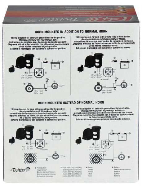 Tromba elettropneumatica 12V, compatta, monotonale. Corrente assorbita a 13V (26V): +/- 18A (9A). Livello sonoro a 2 m: 110 db. Frequenza fondamentale: 300 Hz +/- 5%. Tipo di suono: tono singolo grave. Temperatura di esercizio: 25° - 80° C. Per auto, moto e mezzi pesanti. Omologata E3.