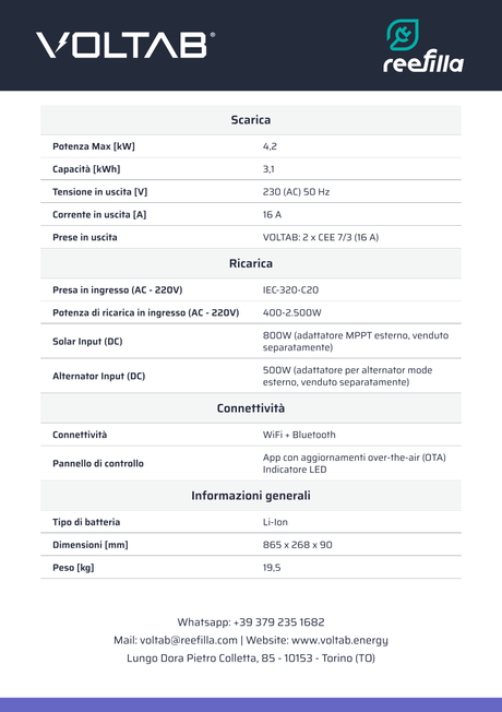 Power Station VOLTAB - Disponibile in tre modelli (VOLTAB, VOLTAB EV, VOLTAB PRO) con capacità di 3,1 kWh e potenza fino a 4,2 kW. Compatta, potente e versatile.