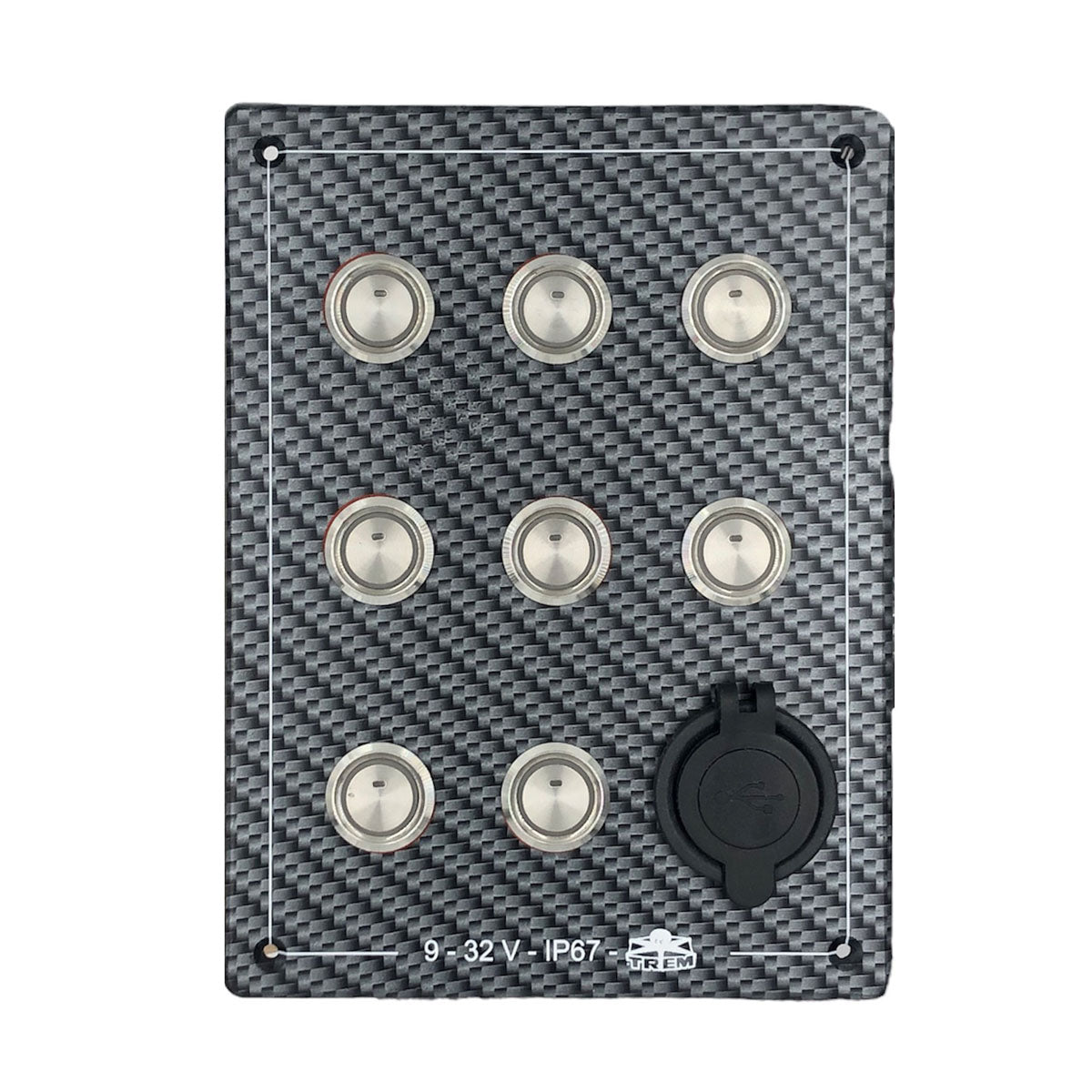 Oberfläche in Carbon-Optik. Weiße Lichtschalter. AISI 316-Taster/Schalter mit Schutzart IP67. 9–32 Volt. Komplett vorverdrahtet mit ca. 1 m Schutzlitze. Ein Sicherungskasten am Ende ermöglicht die einfache Verdrahtung nach Benutzer und das Eingreifen im Fehlerfall. Inklusive Installationsanleitung. CE-geprüfte Tasten und Schalter. Lieferumfang: 5 Schalter L0674021 (20 A), 1 Hupenknopf L0674121 (20 A), 1 Doppel-USB-Buchse L0602435, 2 Seilwindenknöpfe L0674121 (20 A).