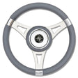 T29 GRAUES LENKRAD Ø 350 MM. 3-Speichen-Lenkrad aus hochglanzpoliertem Edelstahl. Stahlnabe, Echtlederbezug mit Kompassrosen-Logo in der Mitte. Weicher Polyurethan-Griff. 7° Neigung.