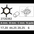 TOHATSU 2T IMPELLER 25-30 HP. Ref. or.345-65021-0 for 2T 25-30 HP engines, dim. Ø internal mm. 17.12 Ø ext.mm.44.1 thickness mm.20.25, nr.6 blades. Tohatsu: 345-65021-0/3R0-650-210M/335-65021-0 - HP 2 Stroke 25-30-35-40 - HP 4 Stroke MFS25A-MFS30A