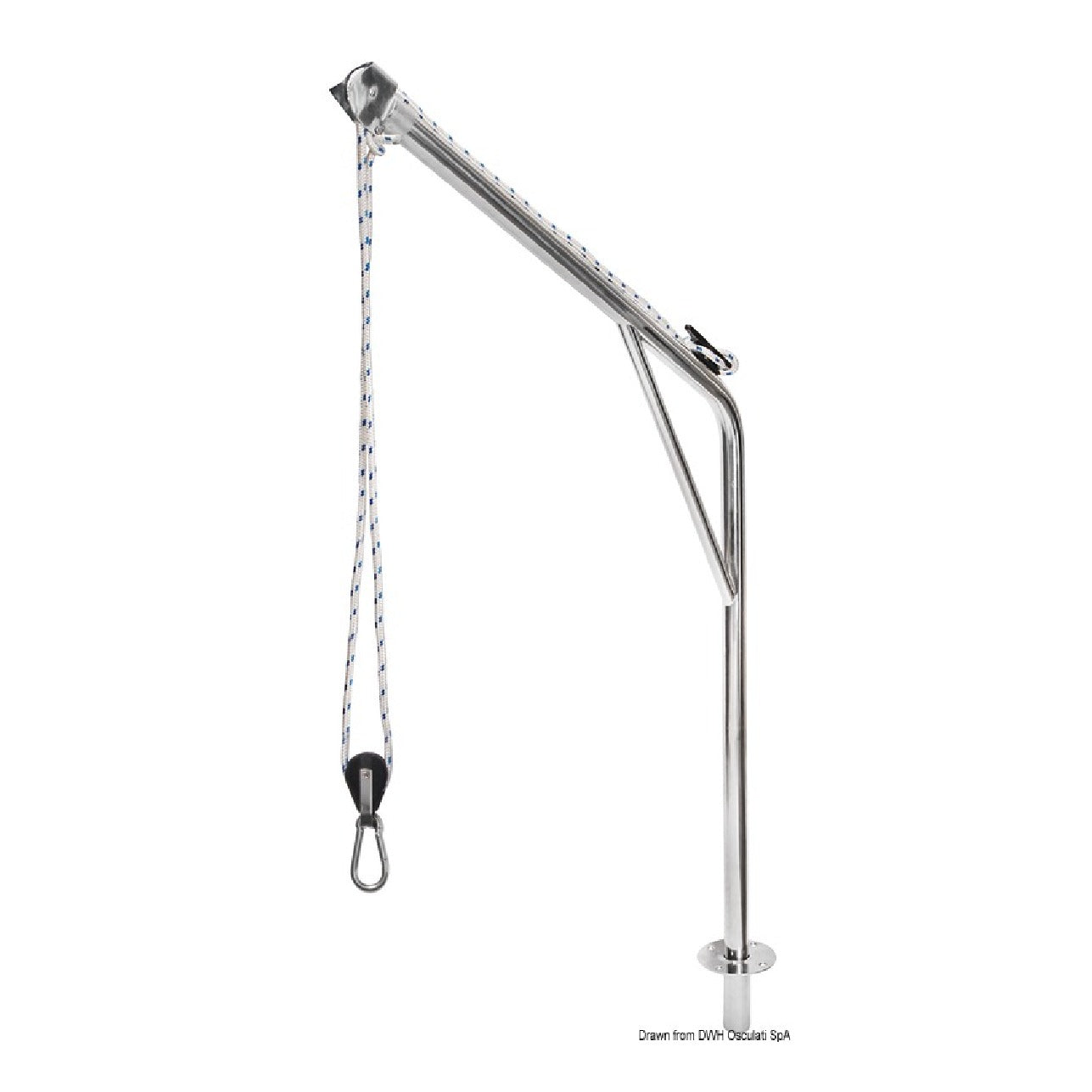Stainless steel davit. Suitable for lifting tenders (in pairs) or for lifting outboard motors. Complete with recessed stainless steel bushing, return pulley, and nylon line. Capacity: 120 kg per pair, tube diameter: 40 mm.