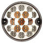 95mm round LED light with brake, position, and turn signal functions. Clear transparent reflector. 17 LEDs, 0.1W each. Dual voltage 12-24V. IP67 waterproof rating. 140mm cable length.