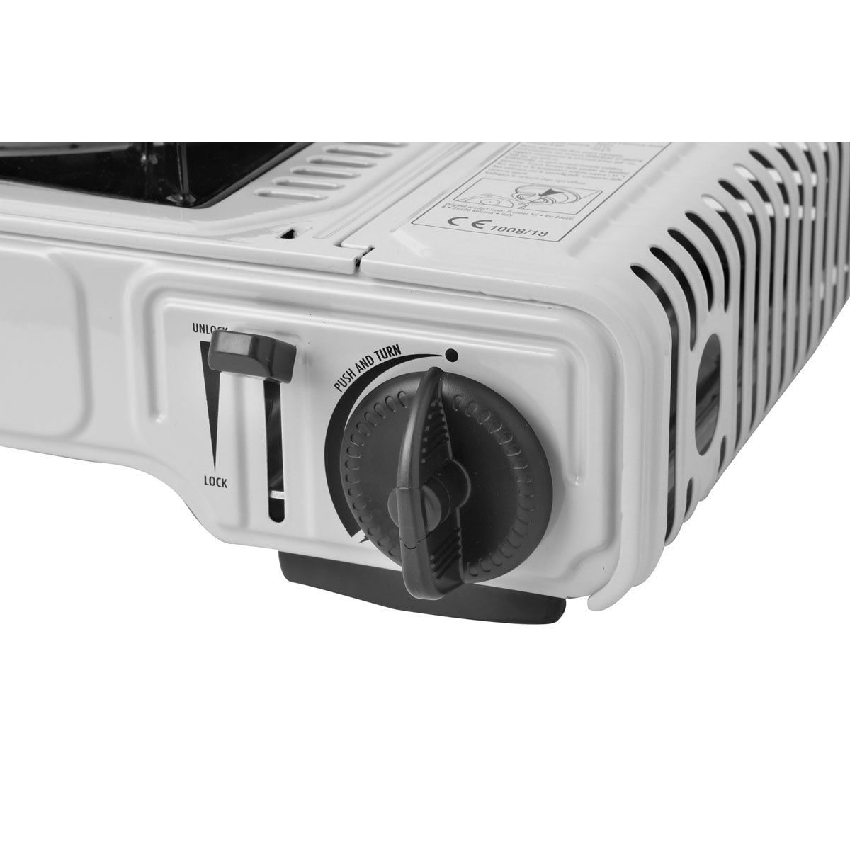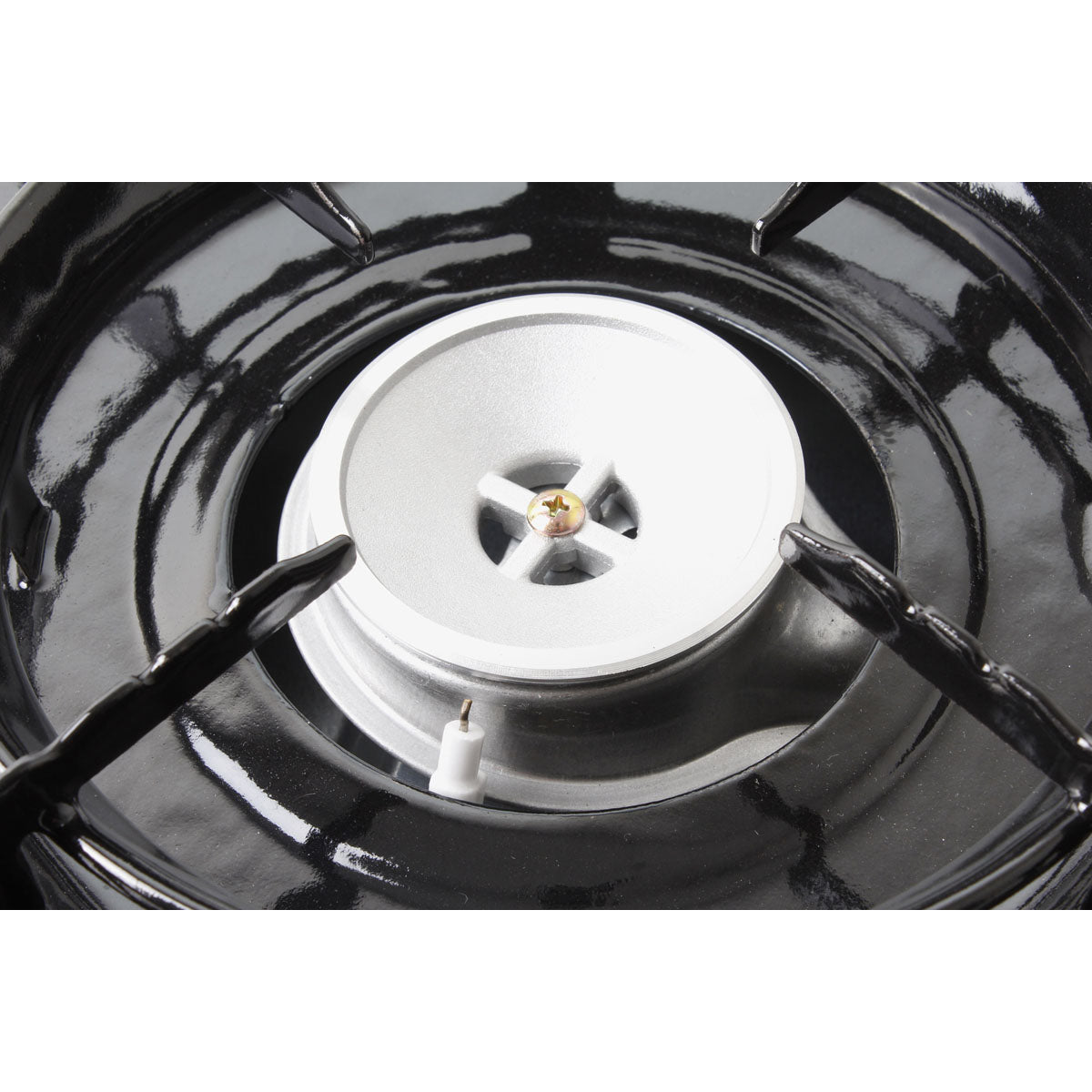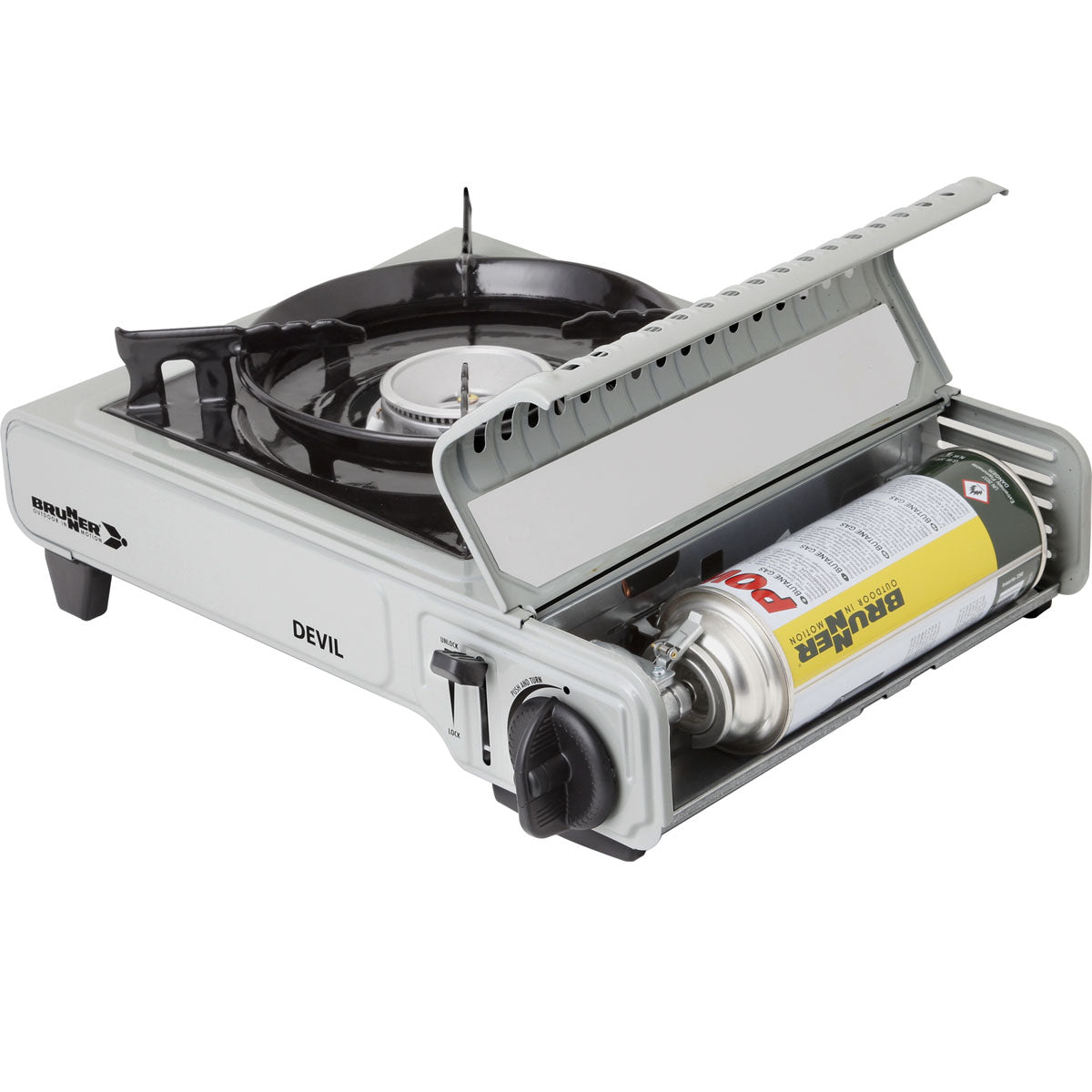 Stove with integrated piezoelectric ignition and aluminum burners. Adjustable gas flow. Comes with a handy carrying case. Operates with gas cartridges. Does not include a thermocouple.