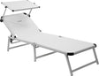 Lettino da sole di alta qualità con struttura quadrangolare, a tre piedi ripiegabili in alluminio anodizzato. Tettuccio parasole regolabile.