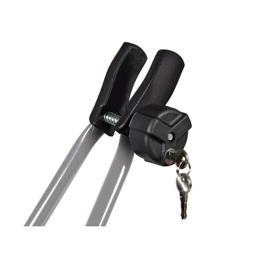 Universal. Complete with lock. Easy to assemble. Supplied with: attachments for roof bars with a maximum section of 47x90 mm and connectors for bars with a "T" profile. For bicycles with circular (20-80 mm) and ovoid (max 80x90 mm) cross-section frames. Rail suitable for all tire sizes. § Notes: Compatible with bars: Quadra, Alumia, Helio, Snap, Club, Kuma, Kargo, Kargo Plus, Whispbar. § Features: ND. § Dimensions: ND. § Color: Grey. § Size: ND. § Size: ND. § Approval: GS-TÜV. Max 15 kg.