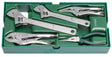 Tray set of adjustable and self-locking pliers. Contents: 2 adjustable wrenches (8" and 10"), 1 set of long-nose pliers (6"), 1 set of curved-jaw lock-pliers (7"), 1 set of long-nose pliers (6").