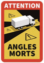 Adesivo lucido con cornice rossa e all'interno, in bianco il disegno del camion, in nero le porzioni di strada visibili e in giallo quelle che sono poco o per nulla visibili dal conducente, il tutto con la scritta in bell'evidenza ''Attention, angles morts''. Previene incidenti dovuti all'angolo morto dei mezzi pesanti: con un decreto da poco approvato in Francia, tutti i mezzi pesanti adibiti al trasporto di persone o merci superiori alle 3.5 tonnellate che transitano nei centri urbani sono obbli